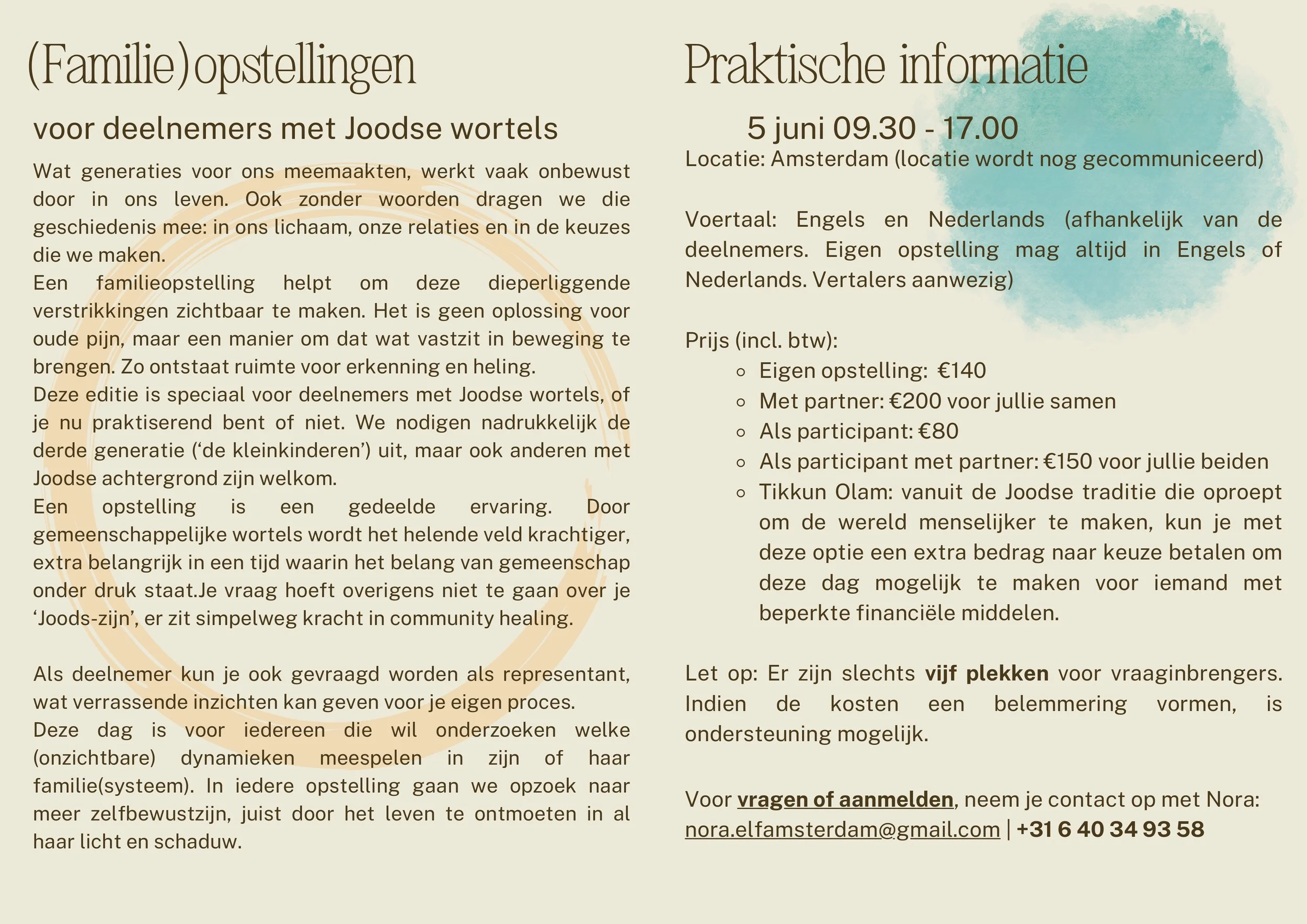 (Familie)opstellingen voor deelnemers met Joodse wortels vrijdag 5 juni 2026 09:30 17:00 Amsterdam, NH Netherlands (kaart) Google Agenda ICS